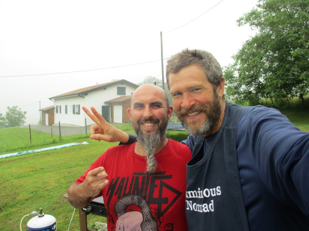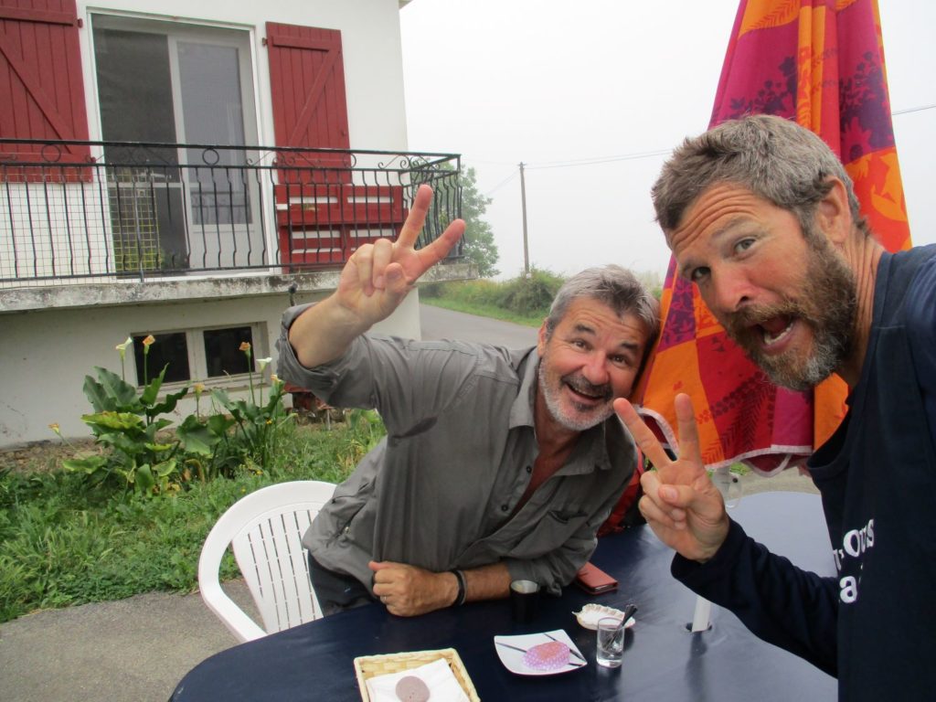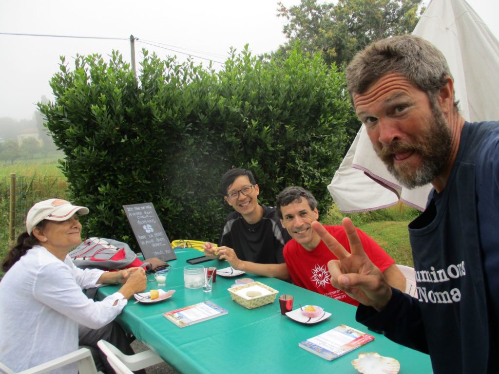 The Way’s foggy-misty flow was truly delightful this morning, and I arrived in good spirits at David’s wonderful donativo cafe in Larribar. Moved by his kindness (the cakes he offered weren’t vegan, and yet the cute cup of coffee certainly was), I decided to remain there awhile and make him a Peace Stone. Thierry arrived shortly thereafter and we hugged and he spontaneously gave me an apple. Three additional pilgrims whose names I did not know and yet who I had seen a few times before arrived as well, and I trounced any & all uncomfo9rtability by asking to be informally introduced. Pascal, Dennis, and Colette were amused indeed by my request, and yet the warmth of their smiles belied the deeper Truth that they, just like me, felt happy (and maybe even grateful) for our more open and intimate interaction* …