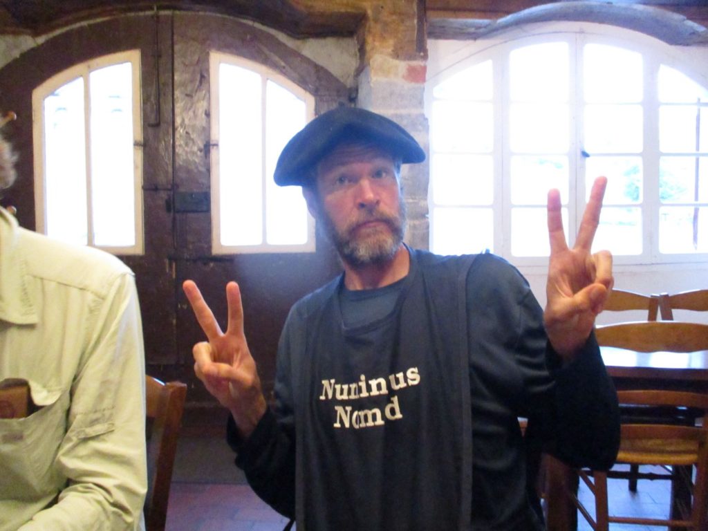 I woke easily after a decent night’s sleep, enjoy a warm wake-up shower, and then headed over to the neighboring pub (which served, at least at that time, as the hostel’s dining room) for a relaxing later-than-usual breakfast with my fellow pilgrims. Even though they had slept elsewhere last night, Stephane & Pierre (who I first met that morning, and who briefly loaned me his outstanding beret – seen in the accompanying image) joined us as well, and the peace & joy that begins to bubble up from all pilgrims as they near the end of their Walk was palpable … Afterwards I made a point of extending an extra dose of sincere kindness to the relatively gruff innkeeper and actually got a brief-but heartfelt smile from him in return, and then it was time to pack up our gear once more and head off to St. Jean Pied du Port – intending, as I had every day prior on this Great Journey, to bring as much Peace & Joy to others as I could along The Way.