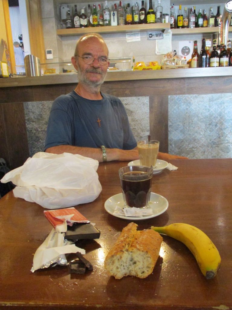And so it was that Stephane & I finally arrived at the town of Zubiri, where Stephane treated me to a meal of my four favorite pilgrimage foods (fresh bread, bananas, dark/vegan chocolate, and coffee) and then bid me a truly heartfelt farewell as he checked into his pilgrimage’s final hostel (which happened to be the very same hostel where I had spent the night here on my first Camino Walk back in 2008) and I somewhat solemnly continued along my own different-yet-similar Way …
