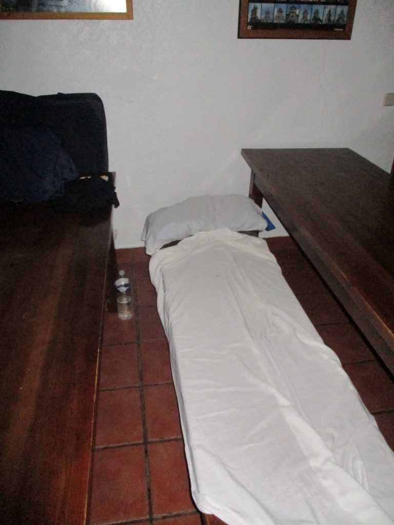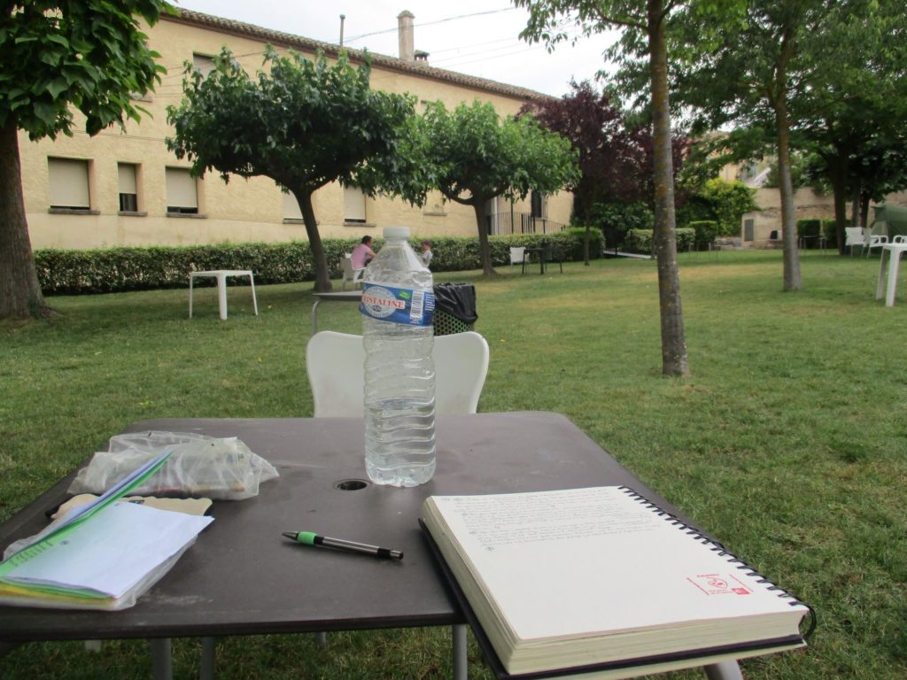 And so it was that I peacefully made my way back to the hostel, and so it was that I sat in the hostels’ garden under a dancing cloud of swallows and wrote a bit of The Walk, and so it was that I lovingly deflected a hospitalero’s open aggression towards me having “the gall” to gently ask where I might find clean drinking water (the water from the hostels’ faucets was an uncomfortable shade of brown – fortunately there was a spring-fed city font located directly across the hostel’s front-facing courtyard; a font I was able to visit without invoking the aforementioned hospitalero’s further ire), and so it was that I waited patiently until later that evening for the rest of my fellow pilgrims to slip into their own peaceful slumbers, that I might then make my humbler bed on the floor of the hostel’s dining hall (and thereby be of no disturbance to anyone’s else sleep whilst I partook of my own) …