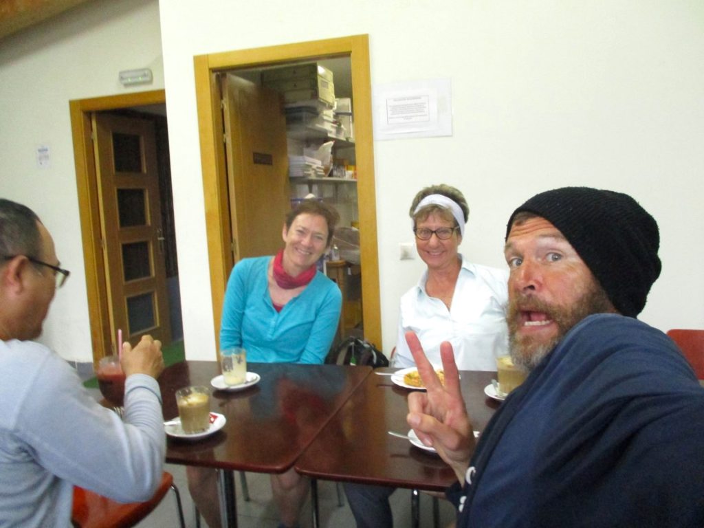 I then suddenly found myself walking next to Terri from Texas (pictured in white on the right) and talking amicably about our mutual disconcert related to over the current over-arching state of humanity – the crystallized fixation with material comforts being gathered and personal needs being met, the increase in individual security purchased at the expense of communal integrity, the almost religious faith being placed in fake news (both “left” and right-leaning) superseding the only way out of our current demise – respectful discourse leading to compassion-based compromise … We then sat together with Lisa (Terri’s sister, on the left, who works in Ethiopia) in the next pathside cafe, and reveled in our peaceful company, while a powerful rainstorm then passed overhead – washing the dust of life away from cantina and pilgrim alike …