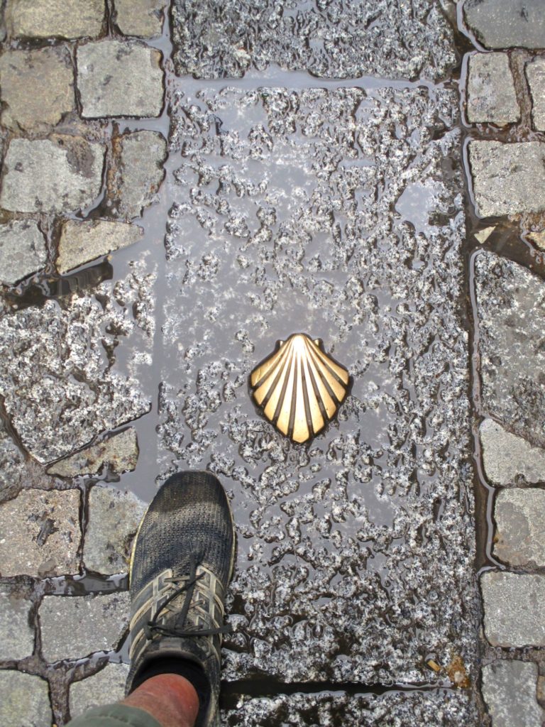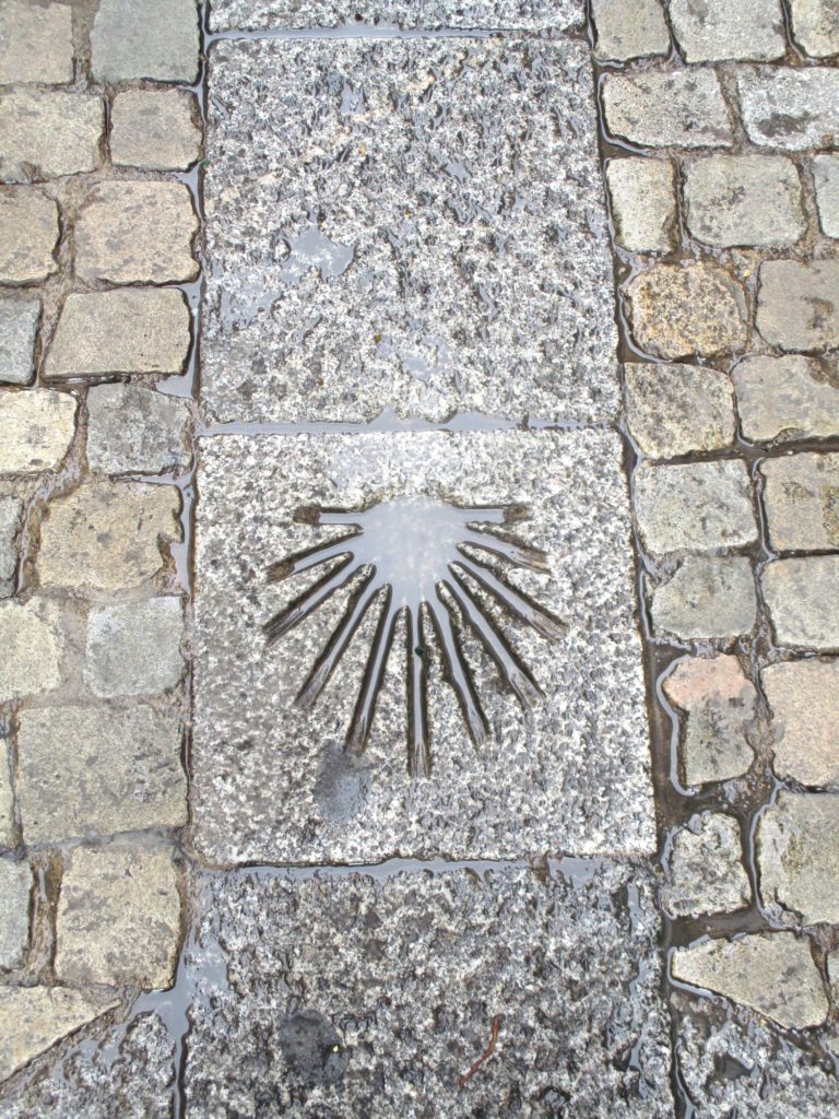 *Often by the “scallop shell” symbol pictured here, a symbol (along the Camino, at least) that reflected the fact that the many established Camino routes of the world all ultimately merge and arrive together at Santiago, and – more importantly – a symbol that represented the more general Truth that even though we are indeed all walking our own unique journeys through life, those treks are all ultimately seeking the same solace – and all ultimately have the same solution (that being replacing “me” with “we”; replacing callousness with caring).
