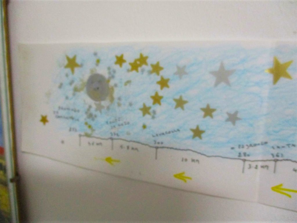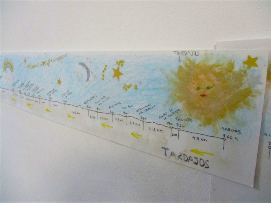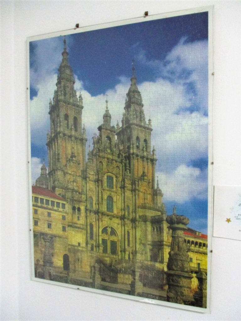 Up and at ’em early once again this morning, and I paused for a moment to marvel at the highly artistic (and also highly informative) Route Map of the Camino that had been created and hung (I assume) by a pilgrim past. How far I have already walked, just in Spain alone – and how relatively close I am to the Santiago cathedral, the Camino’s traditional final landing (and the place where roughly 70% of my own Great Walk will have been successfully traversed)!