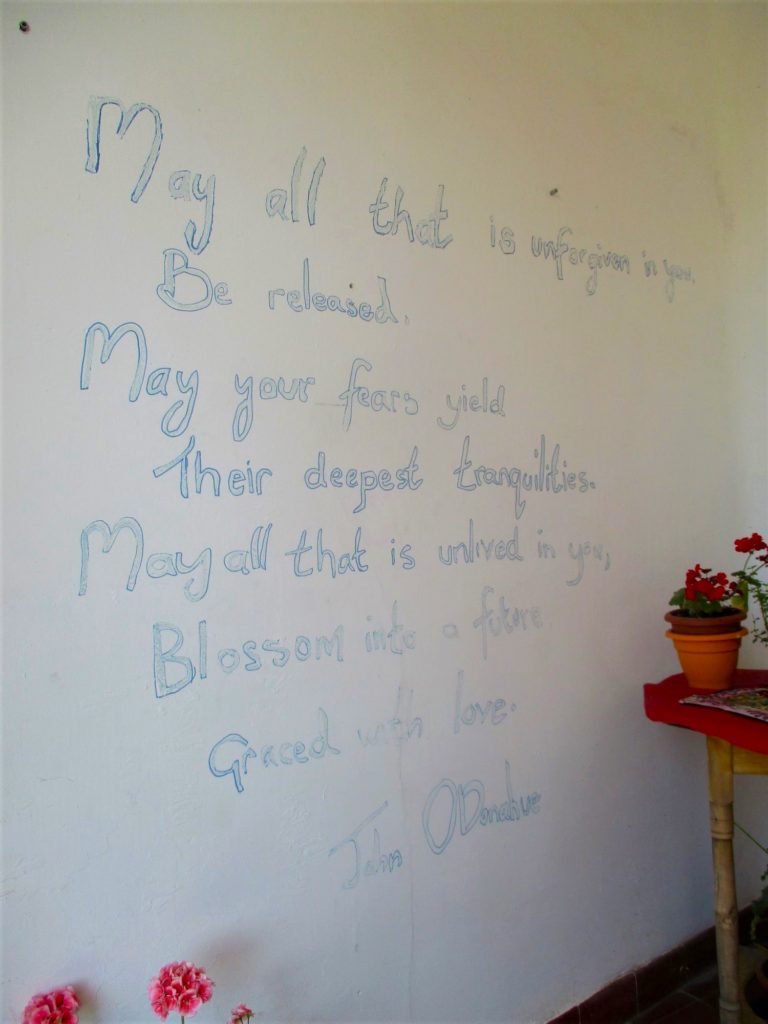 After a time of solitude along the day’s bright & dusty trail, I eventually walked into – and then smoothly out of – the town of Hornillos; stopping only briefly at a closed bar to admire the words of John O’Donahue painted lightly upon its veranda wall …
