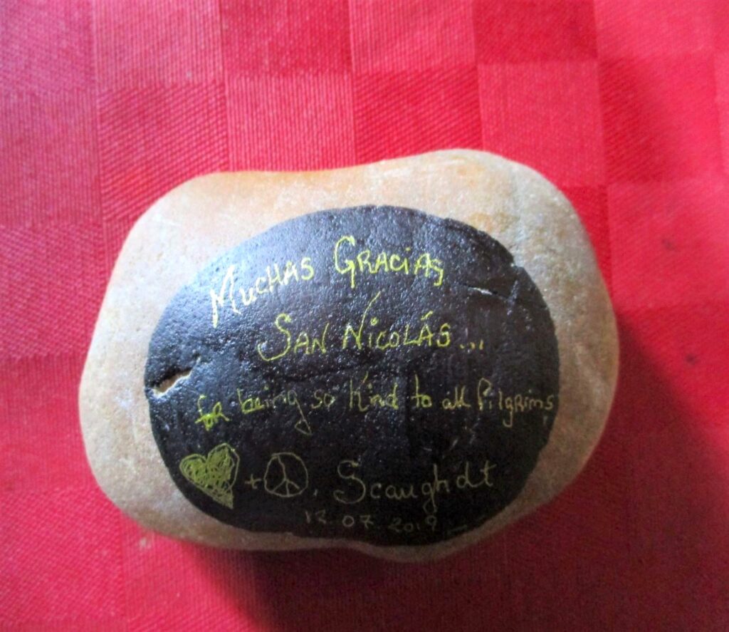 It was gloriously smooth & easy walking that day (a path-trait that would prove to be a common one for much of the next several weeks) and I soon enough found myself at the famed Ermita de St. Nicolas*, the famed donativo hostel of which I had heard so many wonderful things. It was places like this, places that maintained the traditional heartfelt respect & unconditional generosity towards pilgrims, that keep the magic of the Camino alive, and even though it was still very early in the day and I had many more miles still to tread, I stopped in to offer my humble thanks to that kind place. It seemed that more than few others had heard of the refuge’s open-souled graciousness as well, for a queue of a dozen or so other pilgrims had already formed outside (even though it was still more than few hours before the hostels’ doors would open for admittance). The hospitaleros on site were a little off-put when I walked past everyone else and entered the refuge proper, and yet they warmed slightly (yet still skeptically) after I explained that I wasn’t cutting in line, but was rather simply there to offer them thanks for their Great Work and give them the Peace Stone that I had made for them a few kilometers before. They didn’t quite know what to make of this gesture, though they did encourage me to sit and enjoy their last cup of coffee from that morning’s breakfast. An obviously exhausted Taiwanese pilgrim-couple then came over and asked for some coffee as well, I easily offered them my own cup after they were told there was no more. The hospitaleros, still partially convinced that I was somehow trying to scam them for an early admittance into the hostel, soon warmed to me as pilgrim-friend after pilgrim-friend walked past, saw me, and greeted me warmly. It was nice to see their doubt melt away into unbridled kindness thereafter, and I made sure to wish them well and move onward into the day before receiving any other gifts; leaving them with an untainted proof of the selflessness of my journey, and hopefully inspiring them to offer others some of the same …