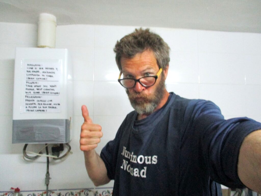 I whisper -chatted with a fellow pilgrim far into the night, and then – after everyone else had fallen fast asleep – I snuck my bedding out the hostels’ sleeping quarters and humbly hunkered down on the kitchen floor for the night; partly to keep my fellow pilgrims from suffering through my potential snoring, and partly to intentionally embody the heartfelt gratitude I felt for the kindness shown to me throughout this challenging day …